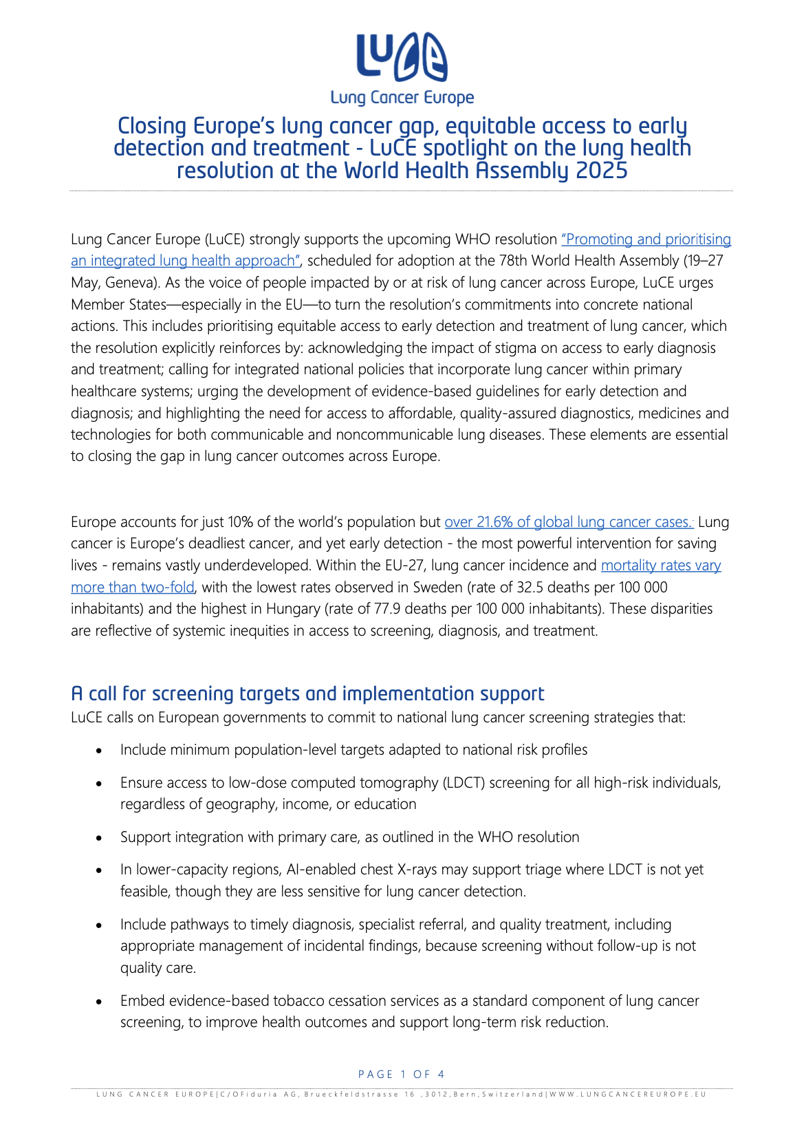 Lung Cancer Europe (LuCE) strongly supports the upcoming WHO resolution “Promoting and prioritising an integrated lung health approach”, scheduled for adoption at the 78th World Health Assembly (19–27 May, Geneva). As the voice of people impacted by or at risk of lung cancer across Europe, LuCE urges Member States—especially in the EU—to turn the resolution’s commitments into concrete national actions. This includes prioritising equitable access to early detection and treatment of lung cancer, which the resolution explicitly reinforces by: acknowledging the impact of stigma on access to early diagnosis and treatment; calling for integrated national policies that incorporate lung cancer within primary healthcare systems; urging the development of evidence-based guidelines for early detection and diagnosis; and highlighting the need for access to affordable, quality-assured diagnostics, medicines and technologies for both communicable and noncommunicable lung diseases. These elements are essential to closing the gap in lung cancer outcomes across Europe.